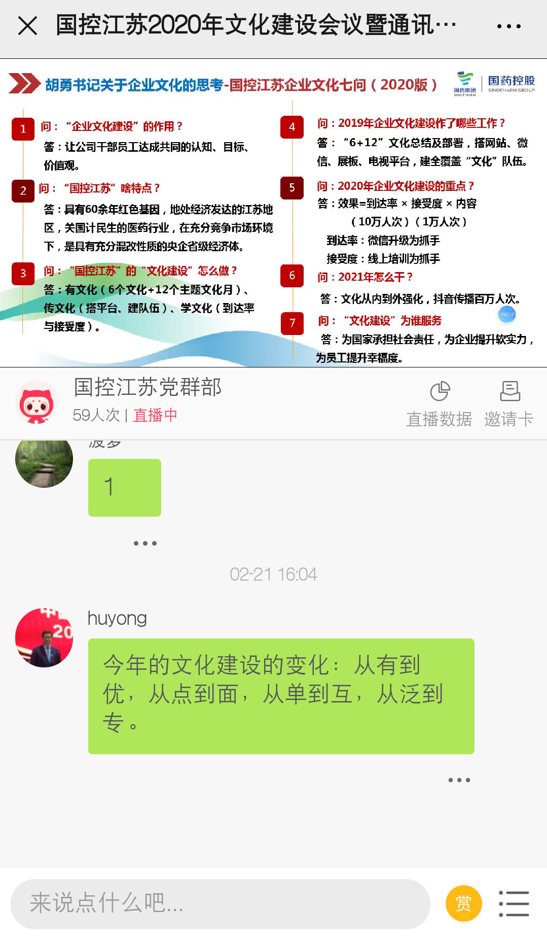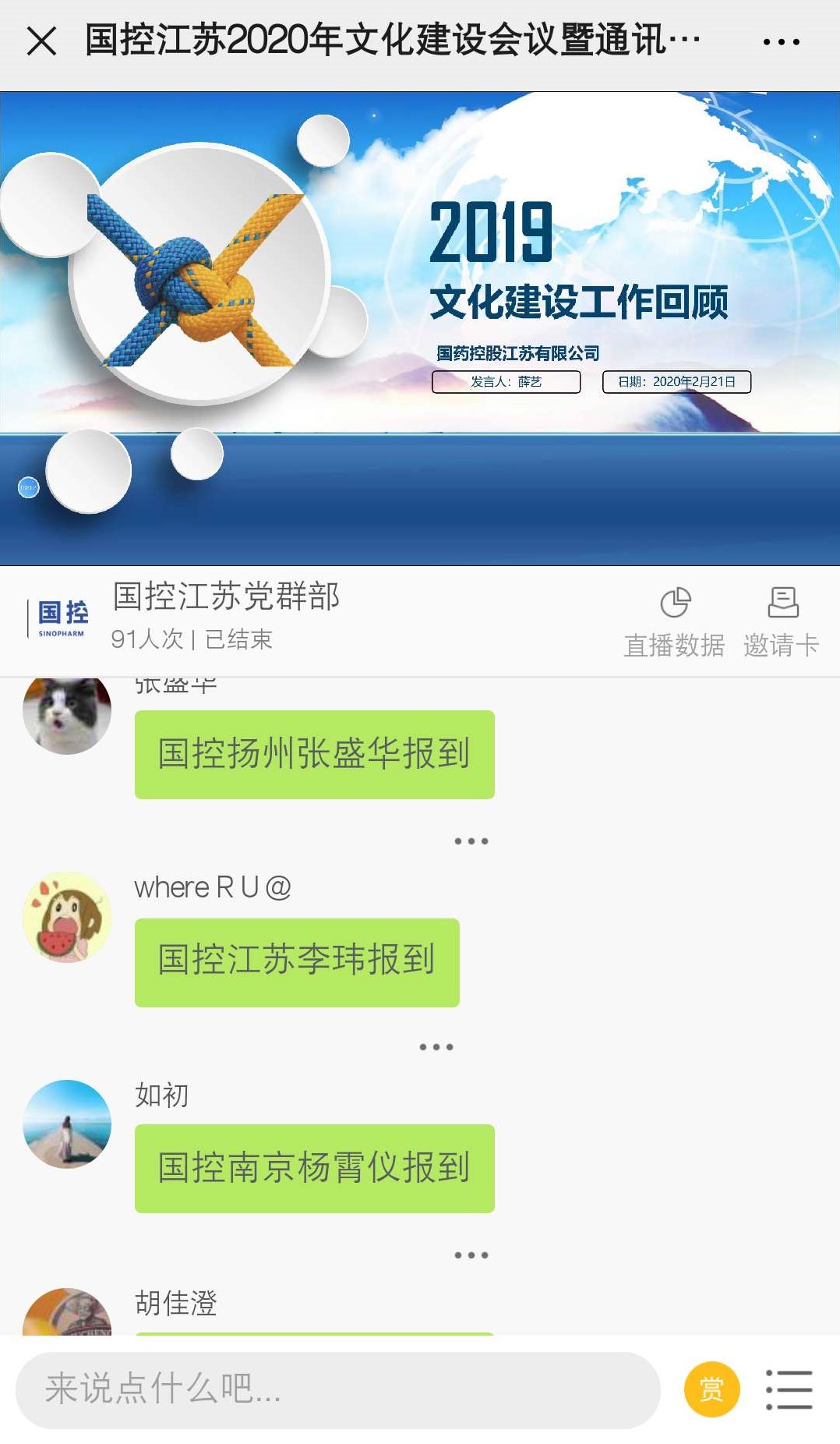 党群部传达了胡勇书记关于2020年文化建设的有关思考,胡书记强调文化建设与企业管理经营密切相关,随着江苏公司不断壮大,通过文化建设统一思想、提高企业认同感、归属感就格外重要,2019年是国控江苏文化建设的元年,在摸索和实践中启动并逐步完善,2020年文化建设要实现从有到优,从点到面,从单到互,从泛到专的转变,真正达到为国家承担社会责任,为企业提升软实力,为员工提升幸福感的服务目标。