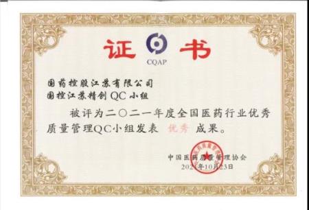 该成果也是做为南京市优秀质量管理小组被市质量协会推荐至中国质协进行参赛,会上被评为2021年度全国医药行业优秀质量管理QC小组的优秀成果!这也是我公司首次立项后就参加了质量管理方面国内最高级别的一个展示。另外在今年选送集团的成果中,同时获得2021 年度优秀QC小组二等奖!
