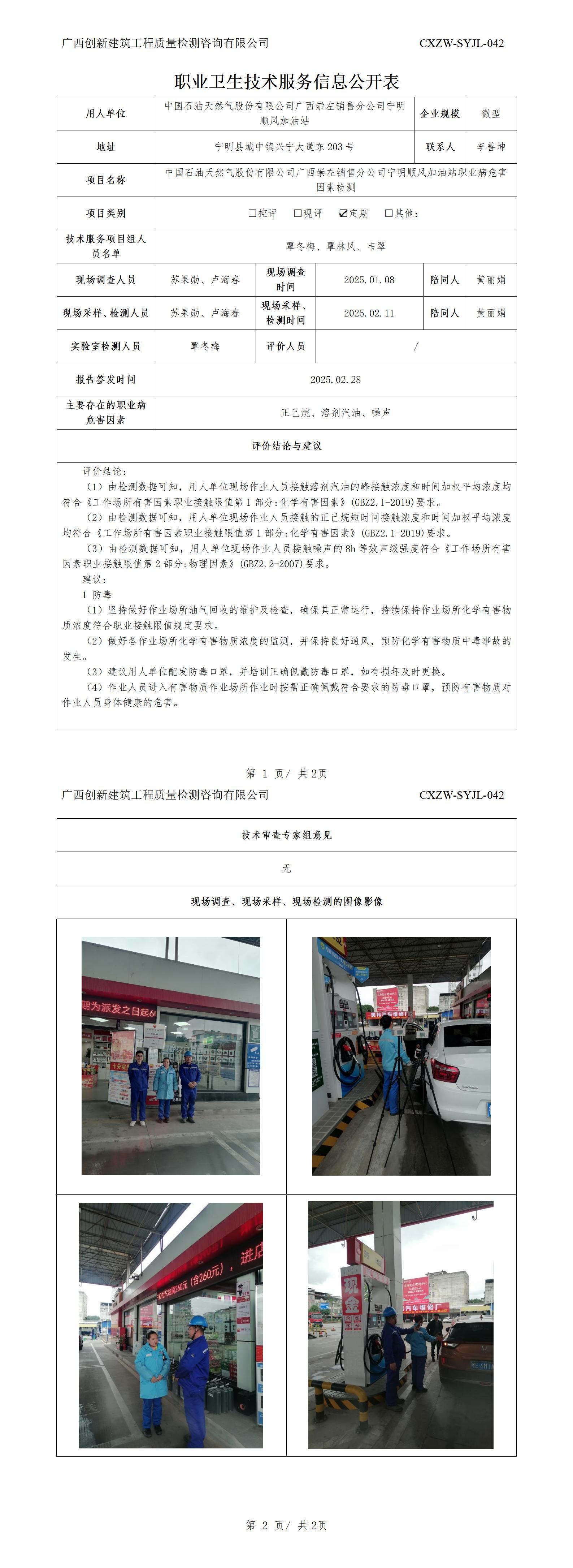 职业卫生信息公开:中国石油天然气股份有限公司广西崇左销售分公司宁明明祥加油站