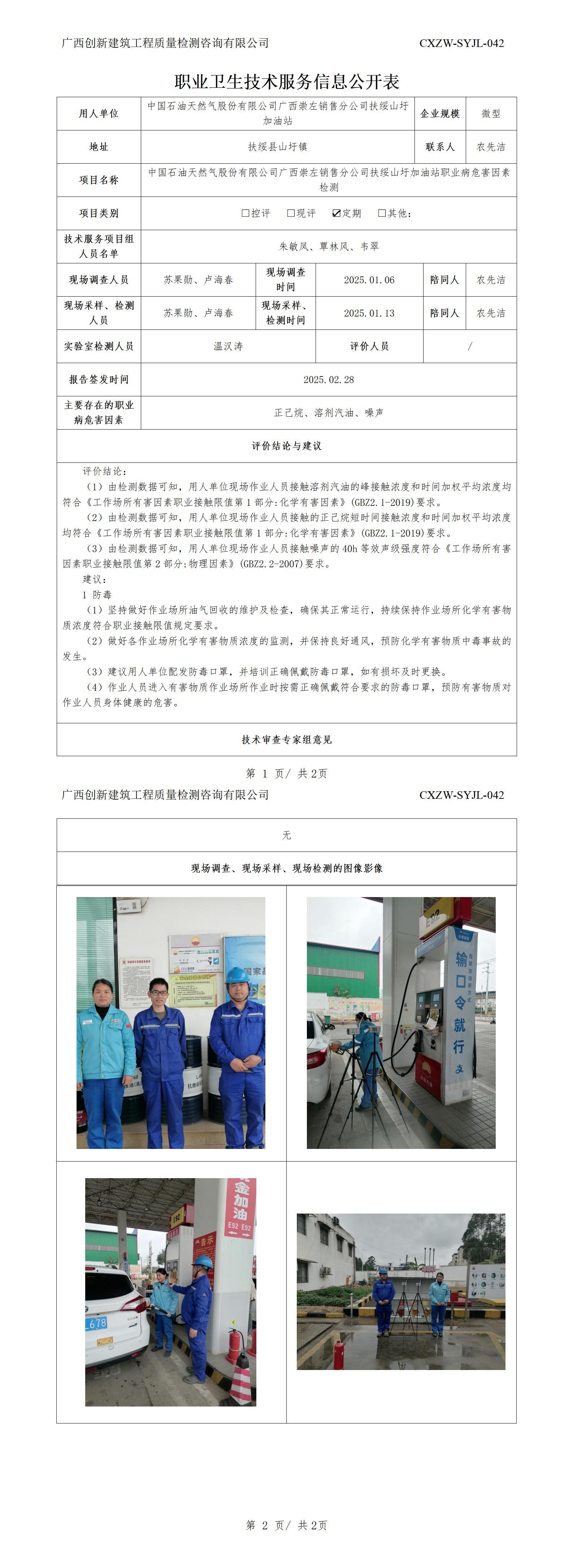 职业卫生信息公开:中国石油天然气股份有限公司广西崇左销售分公司扶绥隆中加油站