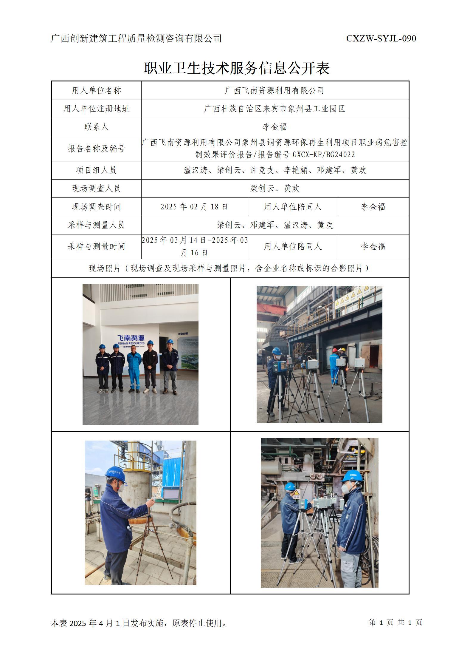 广西飞南资源利用有限公司有价金属回收项目职业卫生信息公开表