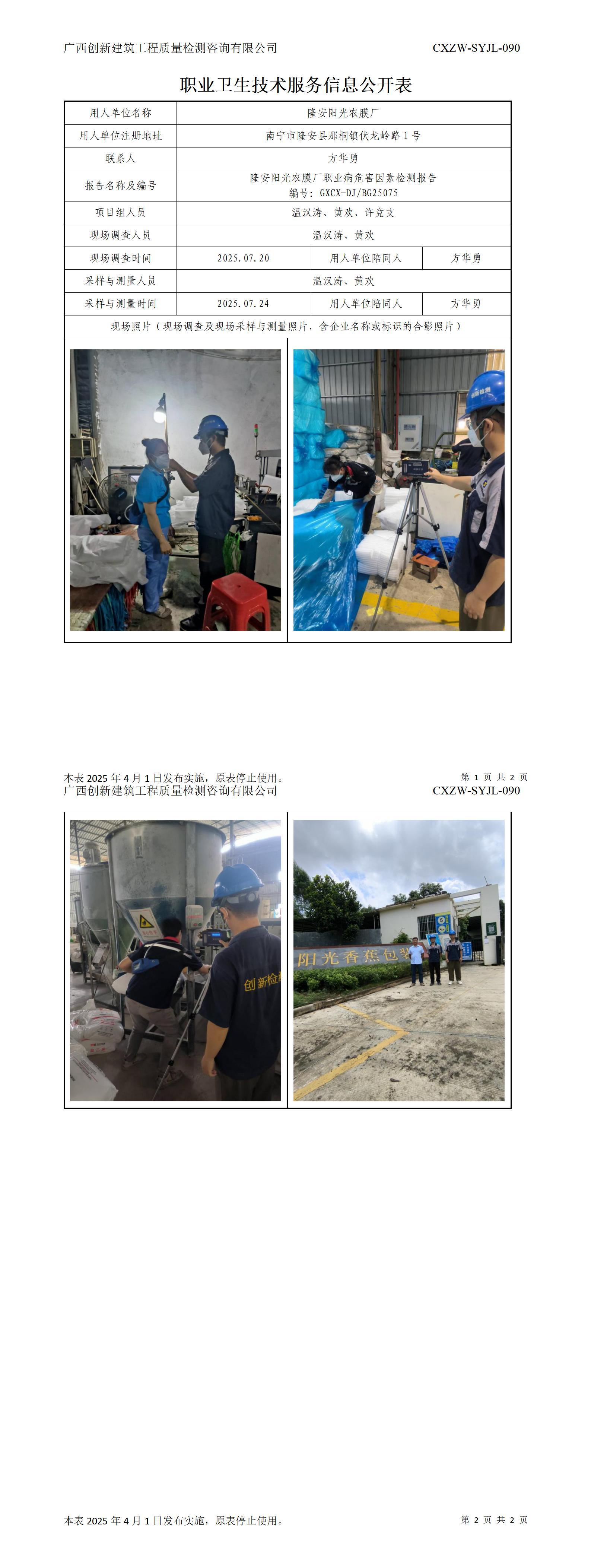 南宁市隆安县佳益塑业有限公司职业卫生技术服务信息公开表