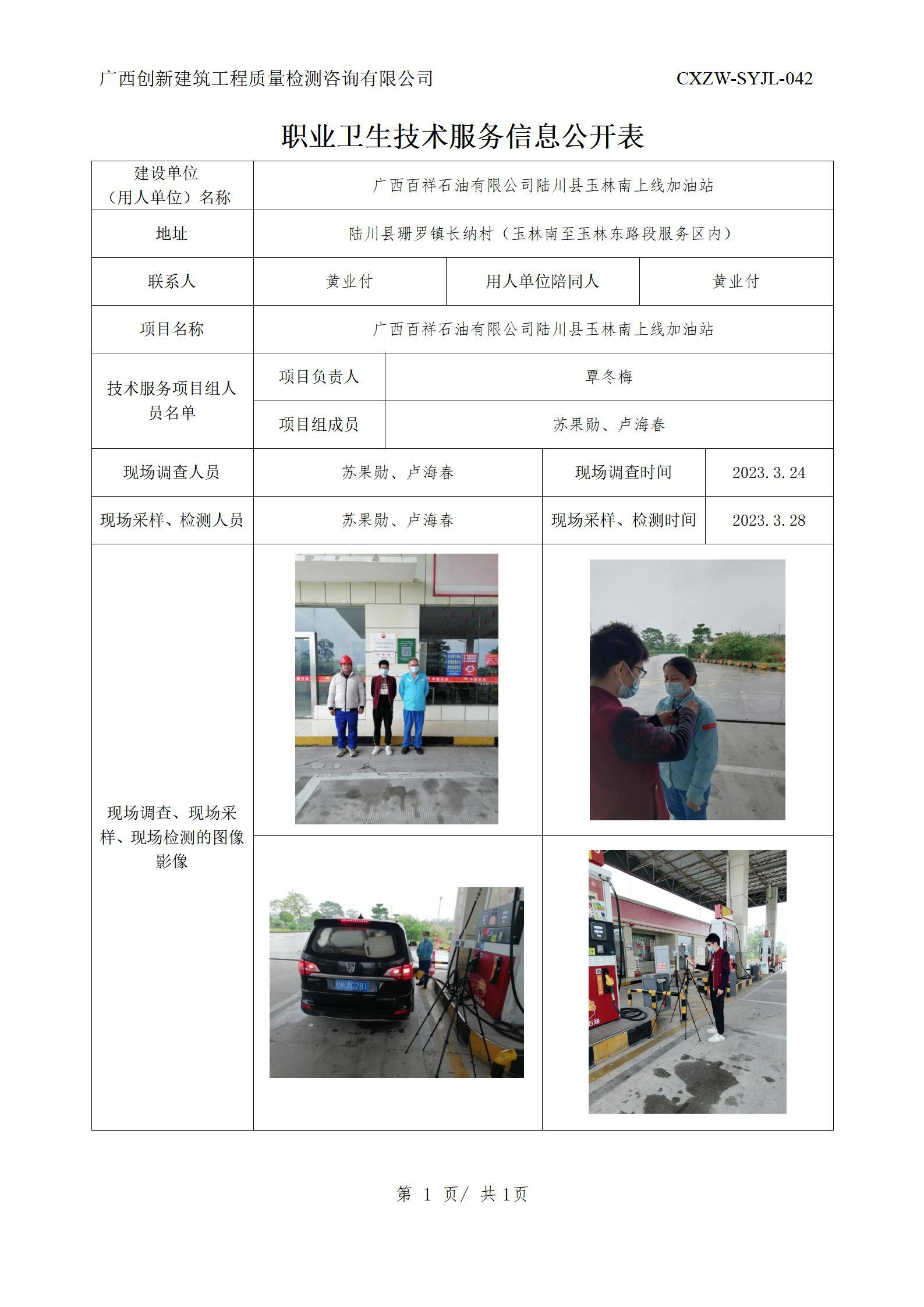 【职业卫生信息公开】广西百祥石油有限公司陆川县玉林南上线加油站